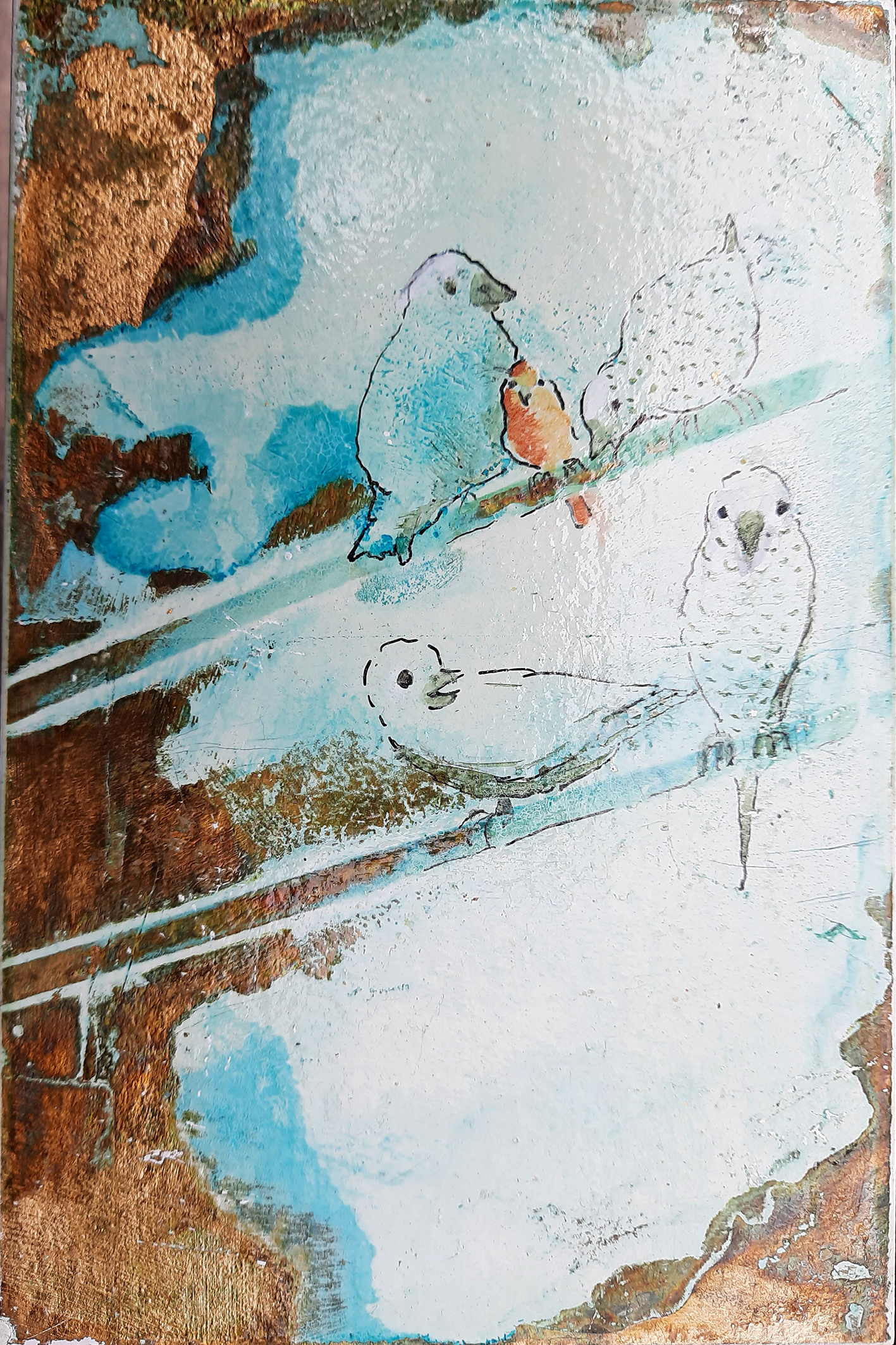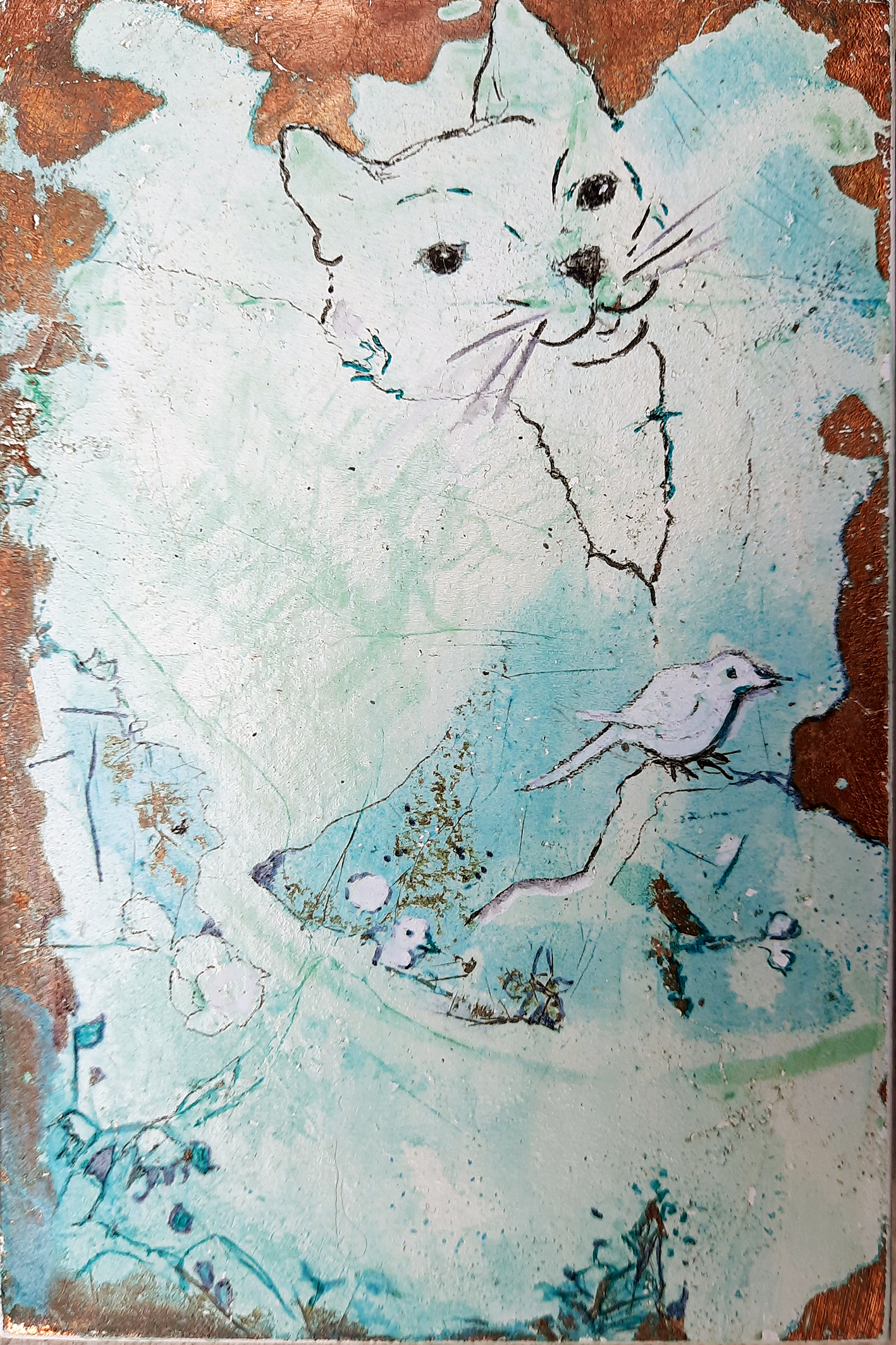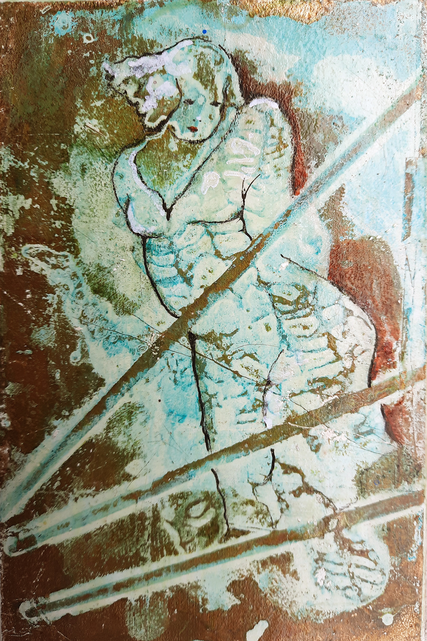 Teknikken med forgyldning og ætsning kom til under uddannelsen i Gamle maleteknikker på Skolen for Kunst og Håndværk i Århus, og jeg tændte straks på det uforudsigelige.